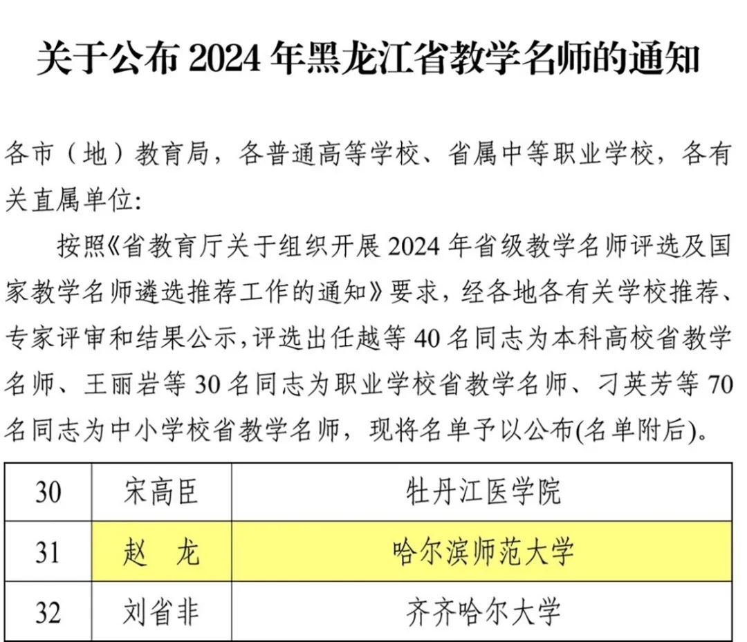 (李璐/文)近日,黑龙江省教育厅发布了《关于2024年黑龙江省教学名师遴选结果的公示》,我校美术学院赵龙教授喜获2024年黑龙江省教学名师奖。