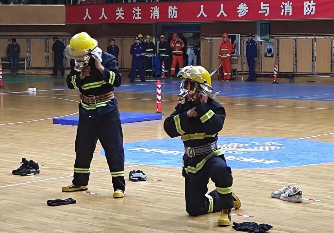 在紧急救援模拟赛中,三位参赛选手密切配合,叶博文、陈长帅携带担架和防毒面具跑到郑艳武模拟的被救者处,为其佩戴好防毒面具,迅速将其抬到指定地点,高质量完成比赛,获得冠军。随后消防战斗服着装赛中,我校选手张枭,动作迅速、操作规范,穿靴子、背背带、粘尼龙扣、戴头盔,系盔带一套动作行云流水、一气呵成,获得亚军;最后进行的消防水带连接接力赛竞争十分激烈,我校选手赵科原、刘洋两名选手,身着消防战斗服,听到开始的口令后,迅速打开消火栓门并启动消防泵,二人迅速将水带连接至消火栓,同时连接水枪,跑至终点线模拟喷水灭火,在规范操作同时,率先完成比赛,最终获得冠军。