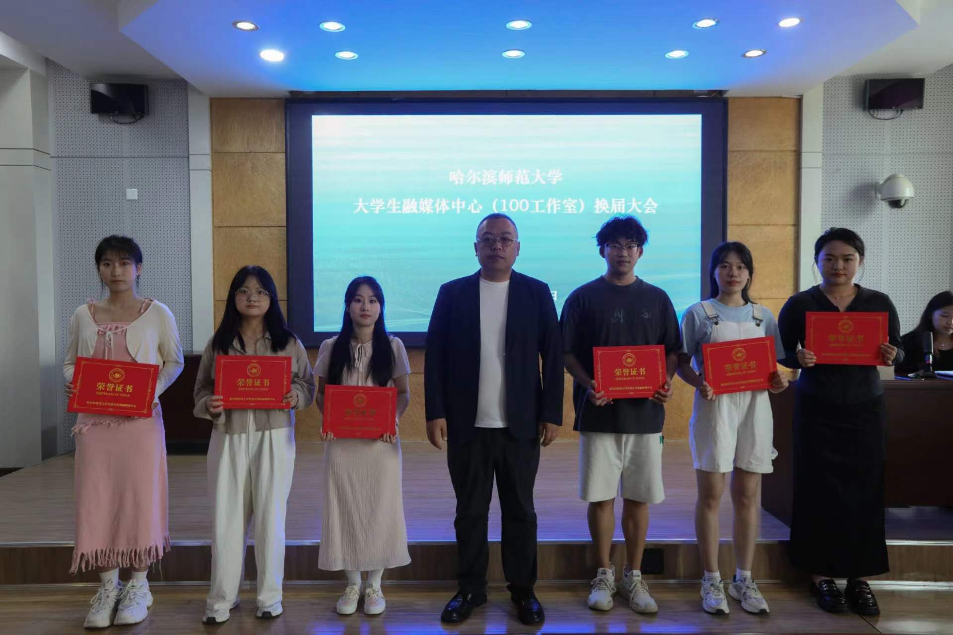六月清风拂心弦,荷叶露珠展笑颜。6月19日,校党委宣传部融媒体中心(100工作室)于行知楼746室举行换届暨表彰大会。党委宣传部指导教师刘恩权、张柏卓然、孙凌枫参加会议。100工作室部分成员参加活动,100工作室新任主任于焱主持会议。