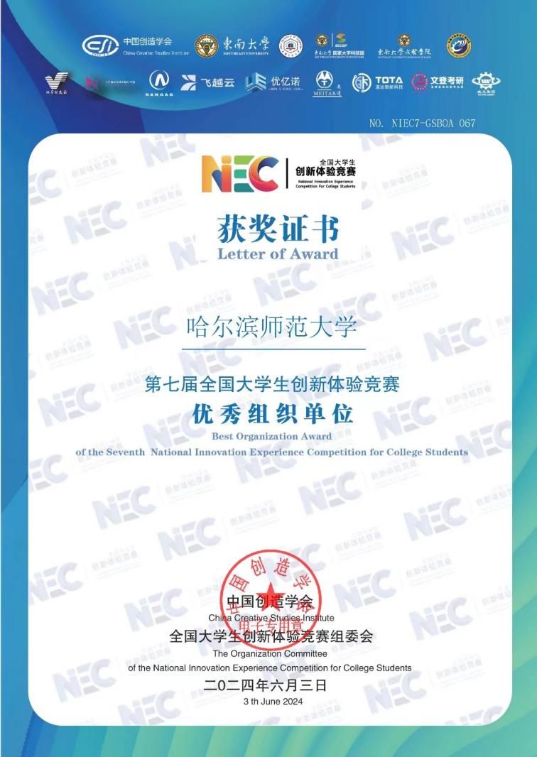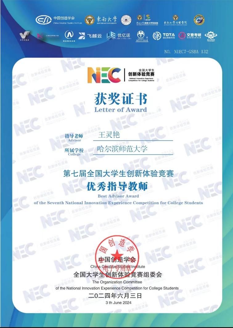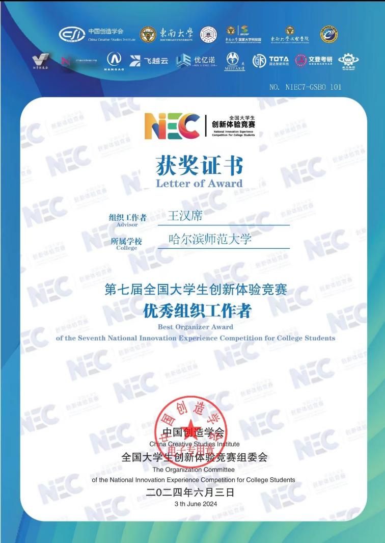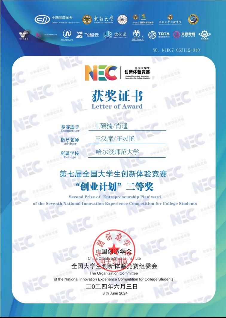 2023年11月,经中国创造学会批准,设立江苏、上海、安徽、山东、湖南、云南、重庆、浙江、福建、广西、粤港澳、京津冀、东北、中部、西南、西北等16个赛区,经由区域赛选拔推荐的参赛项目入围总决赛。经过七天复赛,于2024年5月25日、26日举行线上决赛答辩,共产生国赛获奖作品867组。我校地理科学学院学生在教师王汉席、王灵艳的带领指导下,斩获大赛奖项:2022级地理信息科学专业一班唐睿谦荣获第七届全国大学生创新体验竞赛“创业计划”一等奖(项目名称:构造智联社区、塑造智能未来---数字孪生智慧社区针对性管理平台);2022级地理科学专业行知班王硕楠与2021级地理科学专业一班肖遥组成的团队荣获第七届全国大学生创新体验竞赛“创业计划”二等奖(项目名称:红颜雪境---基于VR技术的“红色+冰雪”智慧文旅)。拼搏在线登录被评为优秀组织单位,教师王汉席被评为第七届全国大学生创新体验竞赛优秀组织工作者与优秀指导教师,教师王灵艳被评为第七届全国大学生创新体验竞赛优秀指导教师。