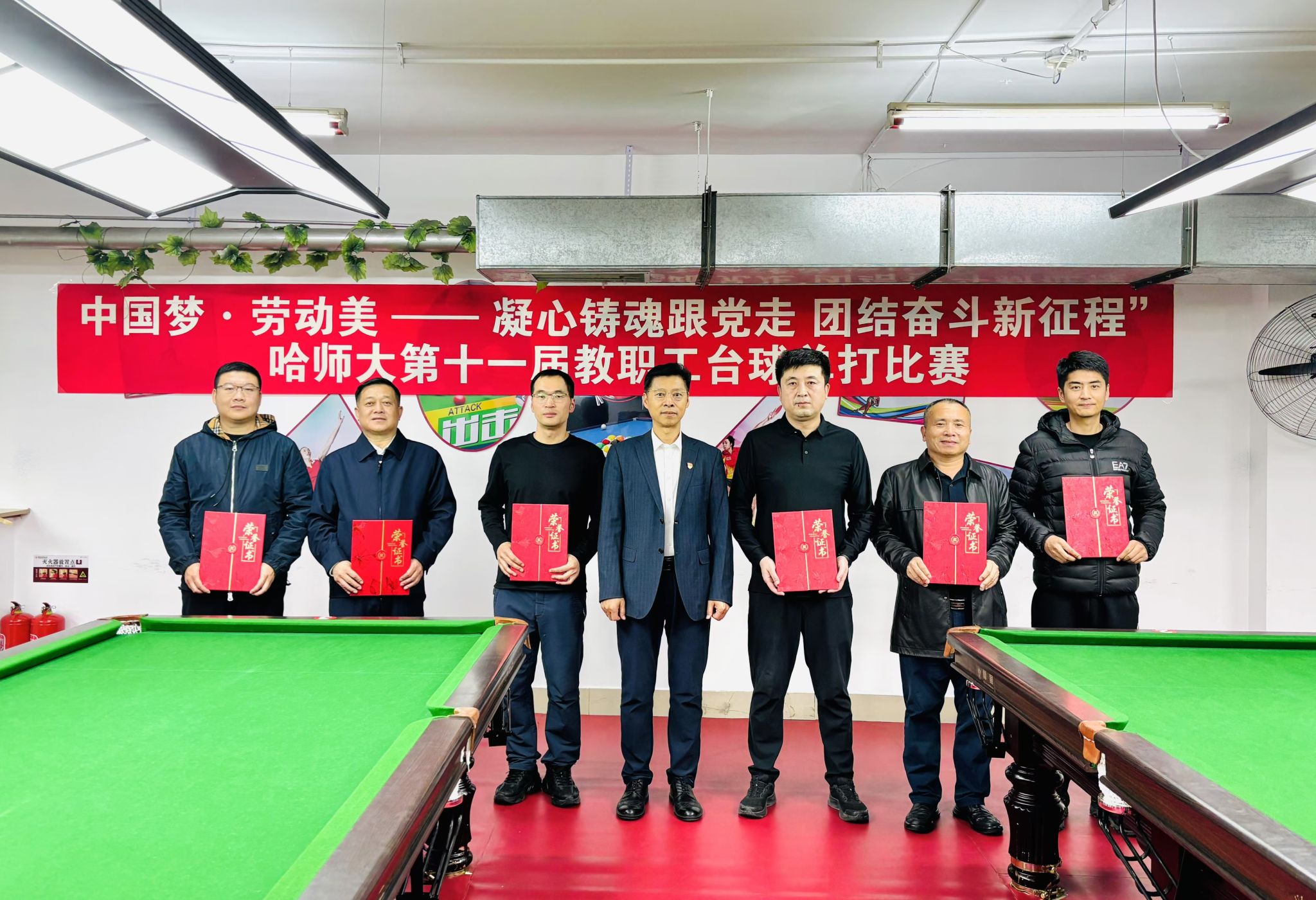 (万浩然/文)10月24日,由校工会主办,教职工台球协会承办的“中国梦·劳动美——凝心铸魂跟党走 团结奋斗新征程”哈师大第十一届教职工台球单打比赛经过四天的激烈角逐,在我校松北校区教职工活动中心圆满落幕,共有来自17个基层工会的百余名教职工参加比赛。