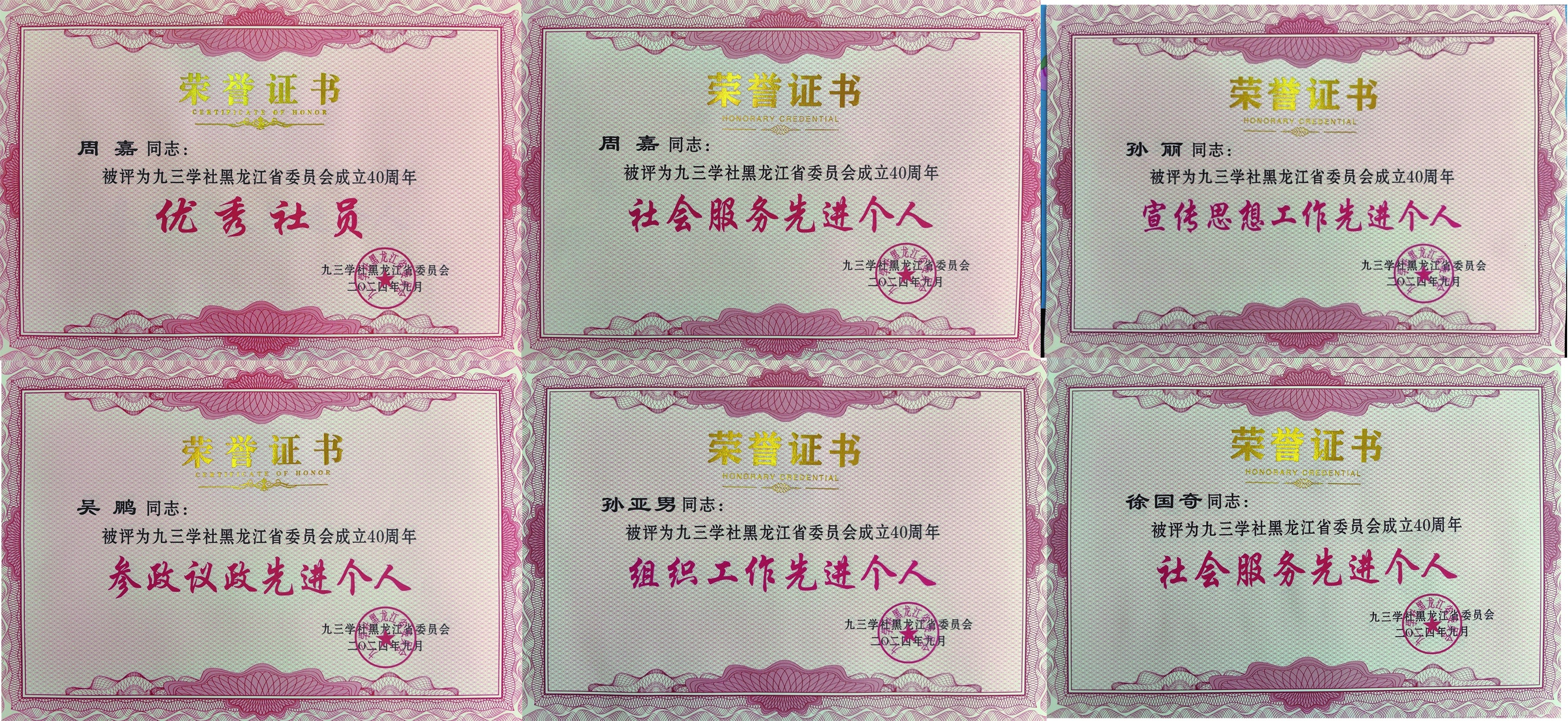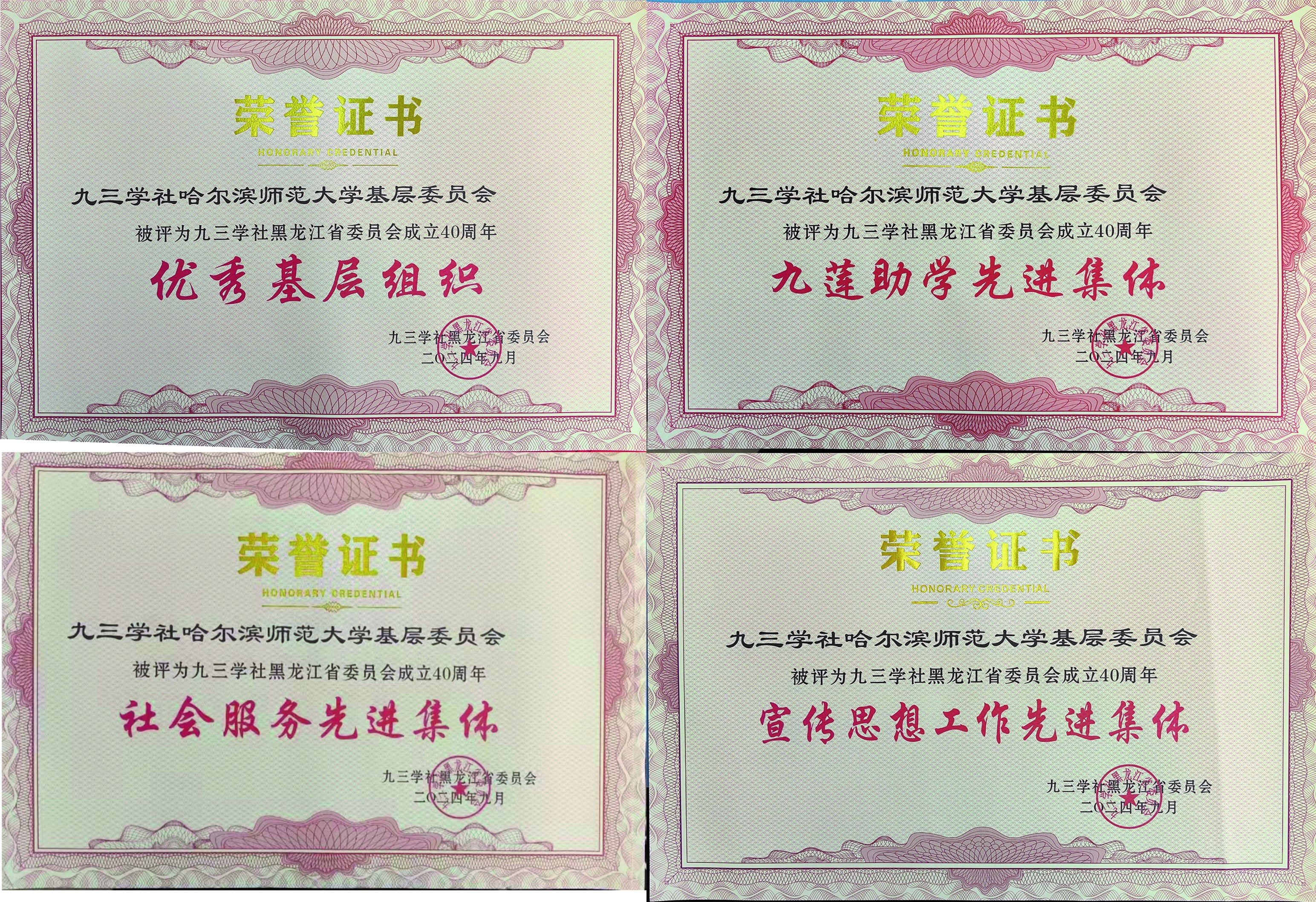 近日,九三学社黑龙江省委通报表彰了一批先进集体和先进个人。九三学社哈师大委员会荣获九三学社黑龙江省委授予的“优秀基层组织”“宣传思想工作先进集体”“社会服务先进集体”“九莲助学先进集体”荣誉称号。九三学社哈师大委员会主委周嘉获“优秀社员”“社会服务先进个人”荣誉称号,社员孙亚男、孙丽、吴鹏、徐国奇分获“组织工作先进个人”“宣传思想工作先进个人”“参政议政先进个人”“社会服务先进个人” 荣誉称号。