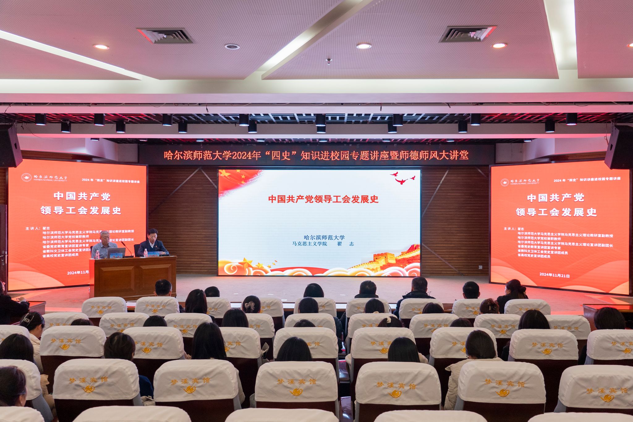 11月21日下午,校工会联合党委宣传部(教师工作部)在我校松北校区梦溪宾馆二楼报告厅举办“四史”知识进校园专题讲座暨师德师风大讲堂。工会常务副主席杨世君,党委宣传部(教师工作部)副部长魏娜、党委宣传部(教师工作部)副部长盛志伟,校工会、党委宣传部(教师工作部)全体干部,各基层工会委员会全体委员,全体新入职教师,各学院教职工代表等三百余人参会。工会常务副主席杨世君主持讲座。