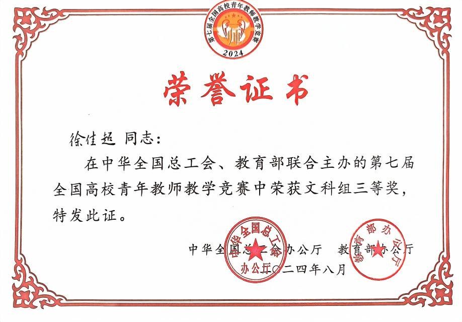 近日,中华全国总工会办公厅、教育部办公厅印发通报,公布第七届全国高校青年教师教学竞赛获奖情况。我校文学院参赛教师徐佳超凭借扎实的专业知识、精湛的教学技能和独特的教学魅力,在比赛中荣获三等奖。