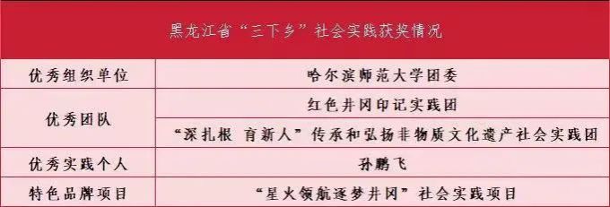拼搏在线登录团委获评2024年黑龙江省“三下乡”社会实践优秀组织单位;红色井冈印记实践团和“深扎根 育新人”传承和弘扬非物质文化遗产社会实践团获评2024年黑龙江省“三下乡”社会实践优秀团队;马克思主义学院党委副书记孙鹏飞获评2024年黑龙江省“三下乡”社会实践优秀实践个人;“星火领航逐梦井冈”社会实践项目获评2024年黑龙江省“三下乡”社会实践特色品牌项目。我校所有荣获省级奖项的组织单位、团队、个人及项目均拟推荐参加全国“三下乡”社会实践活动事迹推报。