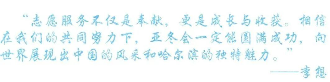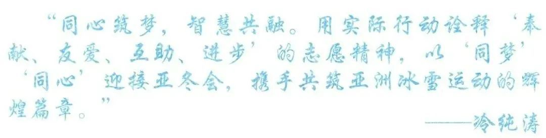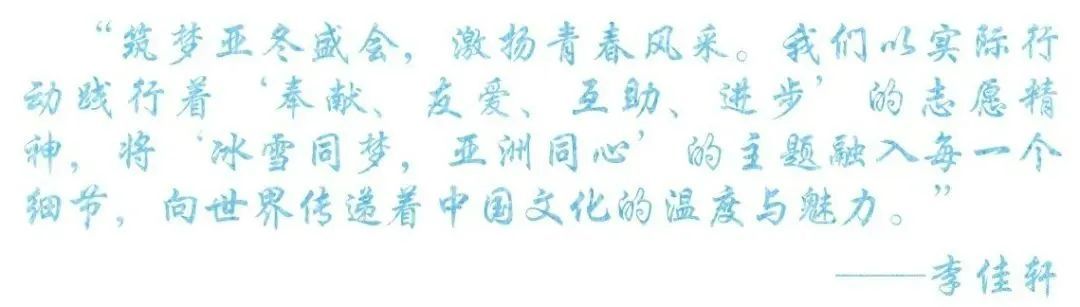 冰雪同梦,志愿同行。亚冬会是一次向世界展示中国、展示哈尔滨的难得机会,能够参与到此次国际综合性冰雪盛会中是非常荣幸和骄傲的。投身于亚冬会开闭幕式场馆观众组织领域的筹备工作,深刻感受到志愿服务不分大小。无论是哪个岗位都在用微小行动汇聚温暖洪流,向观众、向国际友人展现中国青年蓬勃向上、昂扬奋进的精神风貌。志愿者们也从最初的热情使然到如今的责任在肩,学会了奉献与担当,收获了弥足珍贵的成长和感人至深的温暖。我们怀揣着一颗炽热的心,正在一步一步用实际行动诠释奉献、友爱、互助、进步的志愿精神,践行“冰雪同梦、亚洲同心”的赛会主题,为亚冬会的成功举办贡献志愿力量!