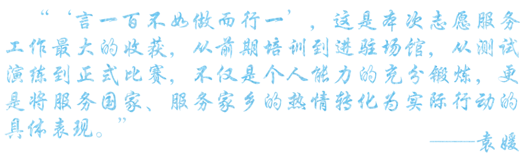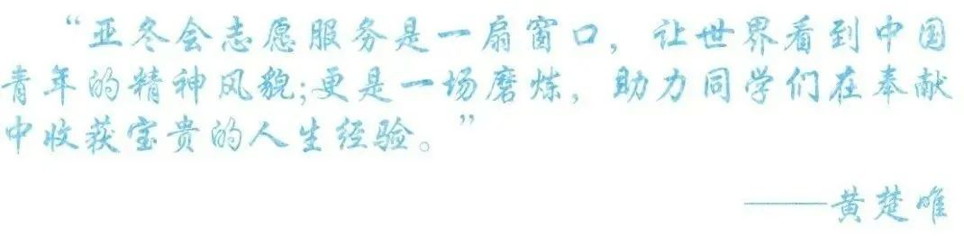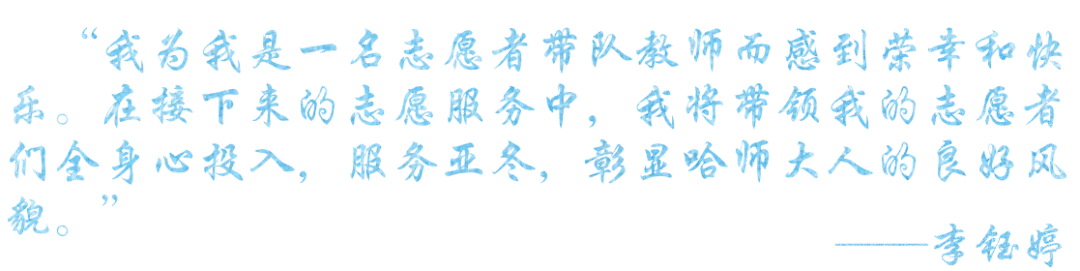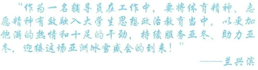 作为亚冬会志愿者带队教师,能够带领学生参与本次志愿服务我深感荣幸、使命在肩、责任重大。带队过程中,与学生志愿者们携手共进、并肩作战,积极应对各种困难挑战、解决各类疑难问题,不仅增长了见识、锤炼了本领,而且收获了情谊。学生志愿者从最初的紧张不安到后来的从容自信,他们的热情奉献和成长进步让我感动。同时,作为一名志愿者,我也深刻体会到了服务他人、奉献社会的获得感、成就感、幸福感。未来,我将努力提升自身能力本领,积极带领学生参与更多的志愿服务活动、贡献青春力量。