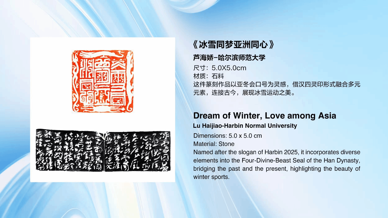 哈尔滨2025年第9届亚洲冬季运动会启幕之际,为让广大媒体朋友充分了解感受魅力无限的大美龙江,亚冬会执委会新闻宣传与媒体运行部精心策划,于2月4日至14日,在亚冬会主媒体中心推出“双亚冬之城哈尔滨2025年第9届亚冬会主题文化展览”。展览共分为魅力之都哈尔滨主题展、双亚冬之城展和亚冬会文化艺术展三大版块。我校美术学院书法系主任、硕士研究生导师芦海娇副教授共有6幅作品入选亚冬会主题文化展览“冰雪情长 印鉴亚冬———篆刻文化艺术展”,向世界、向亚洲传递中国文化,展现大美龙江,彰显冰城魅力,亮出师大名片!
