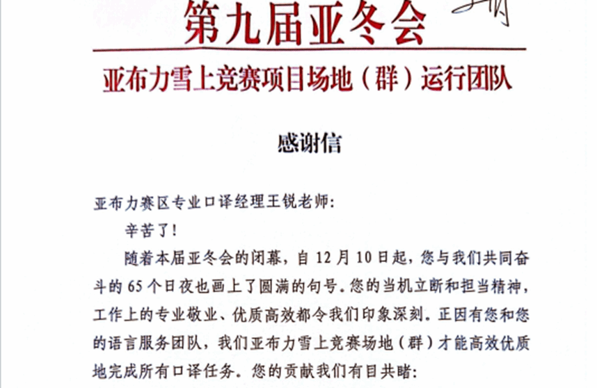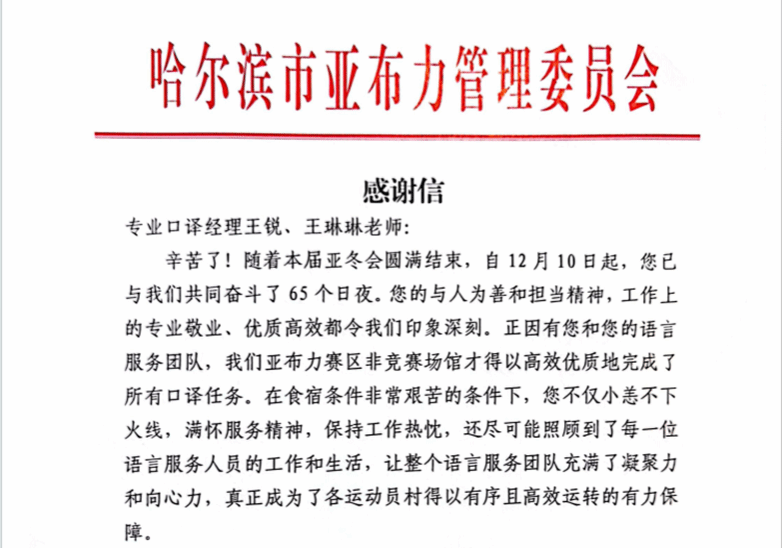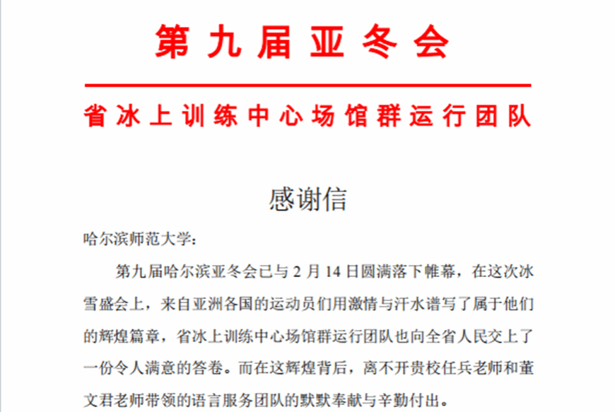 亚冬会期间,他们的身影活跃在所有需要语言服务的地方,冰上场馆、雪上赛道、运动员村、主媒体中心……是他们的组织协调和辛苦付出,让医疗翻译、竞赛技术翻译、赛后媒体采访翻译以及安保工作等顺利进行。为了“家门口”的体育赛事成功举办,为了展示出哈师大人服务大局、奋勇担当的精神面貌,他们不畏苦、不怕累,以高质量的工作成效获得了一封又一封感谢信!