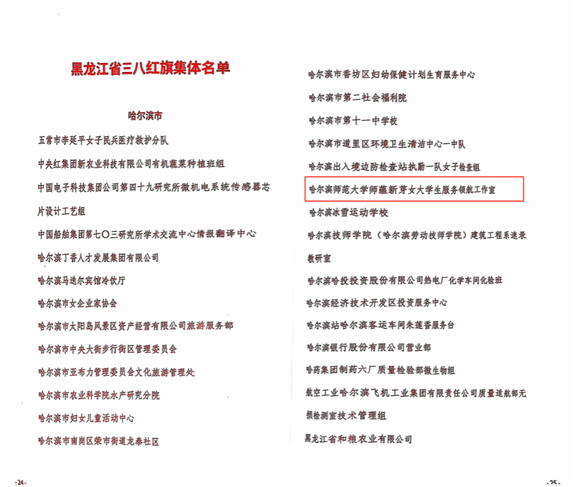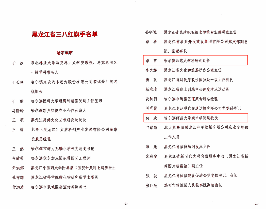 日前,黑龙江省纪念“三八”国际劳动妇女节表彰大会在哈尔滨召开,会上表彰了先进集体和先进个人。我校科研处处长李苗、美术学院教师何欢获“黑龙江省三八红旗手”荣誉称号,“师蕴新芽”女大学生服务领航辅导员名师工作室获“黑龙江省三八红旗集体”荣誉称号。