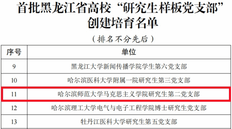 近日,省委教育工委公布了第二批黑龙江省公办高校党建“示范创建”名单和第二批黑龙江省高校“双带头人”教师党支部书记工作室、首批黑龙江省高校“研究生样板党支部”创建培育名单。其中,我校传媒学院党委获批“省党建工作标杆院系”创建培育单位,传媒学院广播电视艺术系教师党支部、斯拉夫语学院教师党支部、西语学院英语教育系教师第一党支部获批“省高校党建工作样板支部”创建培育单位,马克思主义学院哲学教研室教师支部寇鹏飞工作室获批“省高校‘双带头人’教师党支部书记工作室”创建培育单位,马克思主义学院研究生第二党支部获批“省高校研究生样板党支部”创建培育单位。