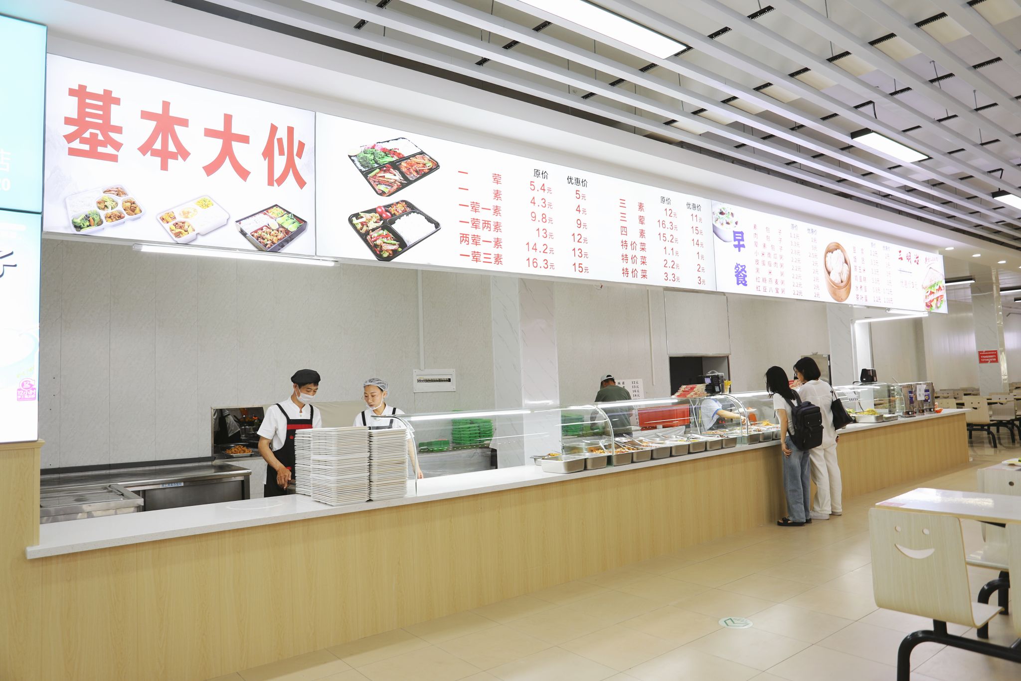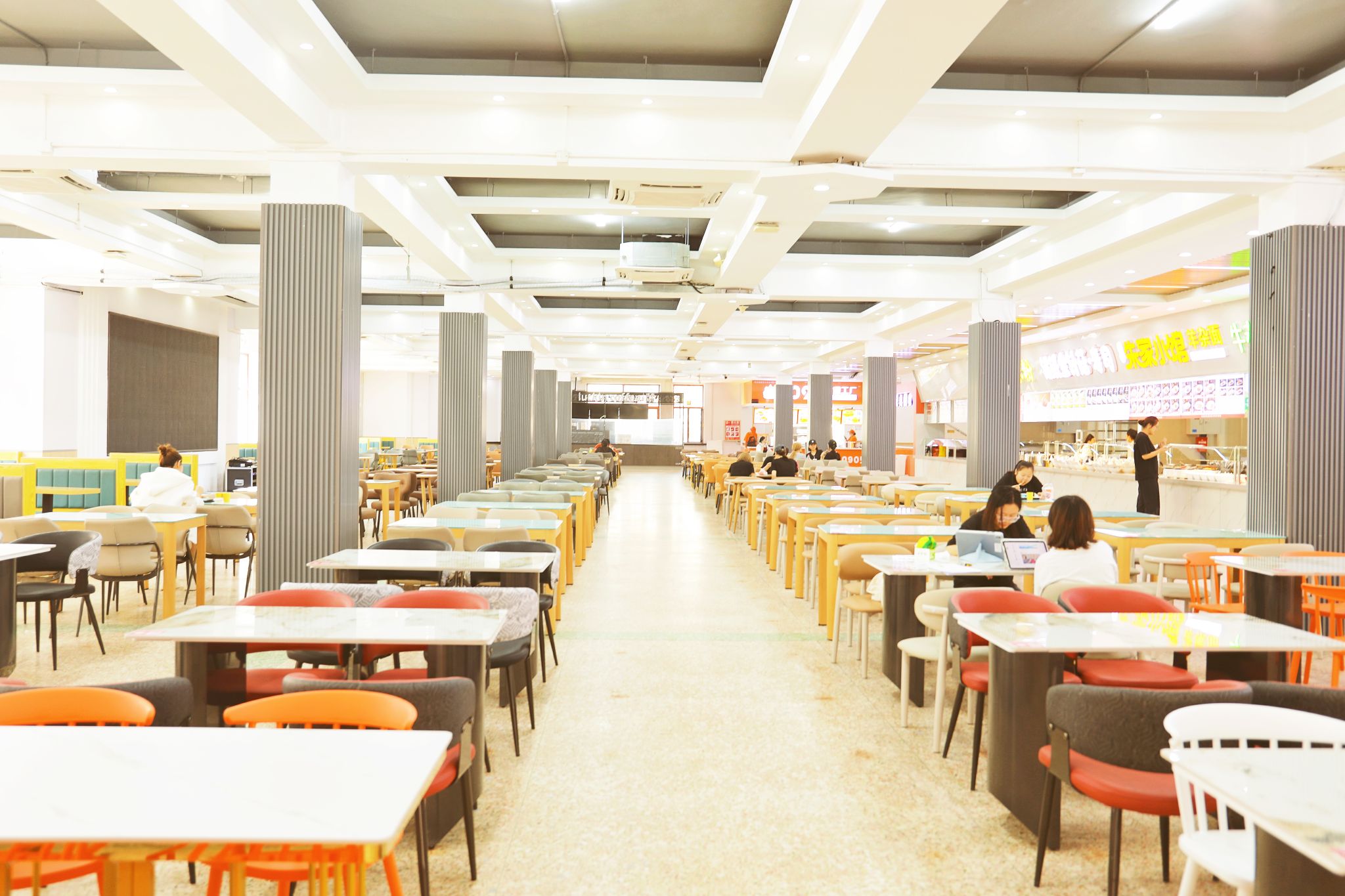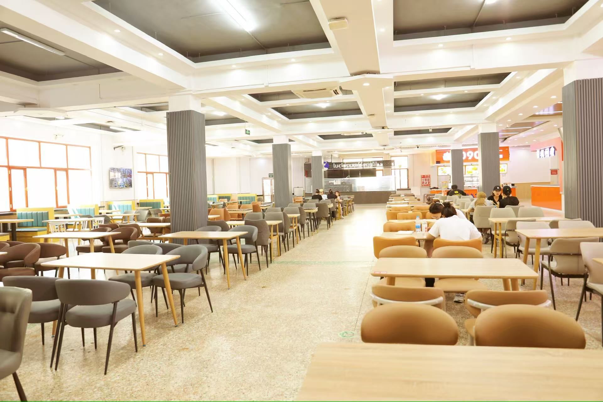 升级后的百谷园食堂呈现“一廊两区”的全新布局——“艺飨时光”艺术走廊串联起“艺飨餐厅”与“时光餐厅”两大就餐区域。整体采用现代简约装修风格,以“简约、明亮、整洁、规范”为主基调,对就餐空间进行科学规划:新增四人桌及舒适卡座等多元就餐位,满足师生单人用餐、好友小聚等不同场景需求;全面升级空调与通风系统,营造恒温舒适的就餐环境,让师生在就餐时更感惬意。