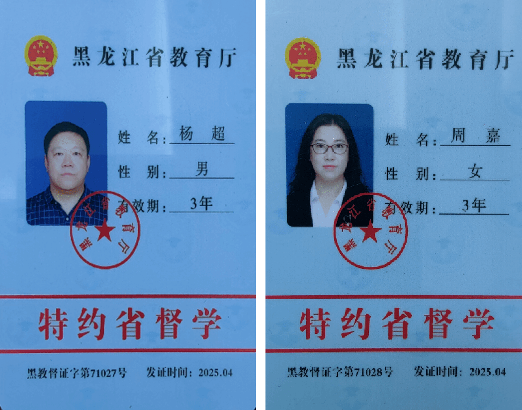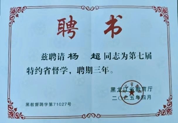 近日,省教育厅为第七届特约省督学颁发聘书。我校省政协委员、民盟哈师大委员会主委杨超,省政协委员、九三学社哈师大委员会主委周嘉两位党外人士受聘担任第七届特约省督学。
