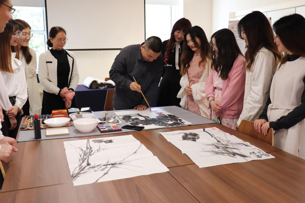 在水墨画课上,姚瑞江老师向大家介绍了水墨画作画的纸笔,常见水墨画主题的含义和水墨画的用笔方式,随后便和同学们互动起来,按照同学们的要求在宣纸上泼墨挥毫,各种美丽的花朵便在宣纸上竞相开放,争奇斗艳。最后的体验环节,在姚老师的专业指导下,大家都完成了一幅自己的水墨画。
