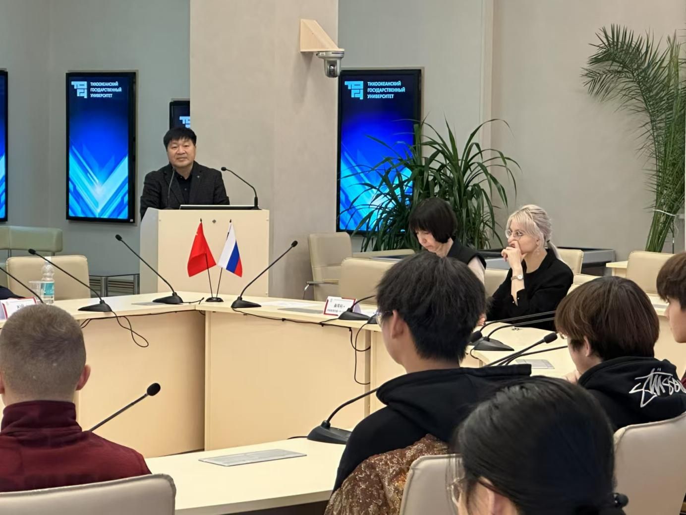 随后,专家团队前往太平洋国立大学继续进行学术交流活动。在与太平洋国立大学校方代表的会谈中,专家团队介绍了我校的学科建设和国际合作情况。双方还就进一步的教育合作和学术交流议题进行深入探讨。太平洋国立大学副校长尼古拉·索罗金对专家团队的到访表示感谢,并希望能在现有合作基础上拓展更多教育研究合作。专家团队还向俄方介绍我校汉语国际教育、孔子学院建设以及留学生招生政策,进一步促进两校在教育和文化领域的交流与合作。在太平洋国立大学进行的学术讲座同样反响热烈,俄方师生与我校专家进行充分互动,讲座取得圆满成功。