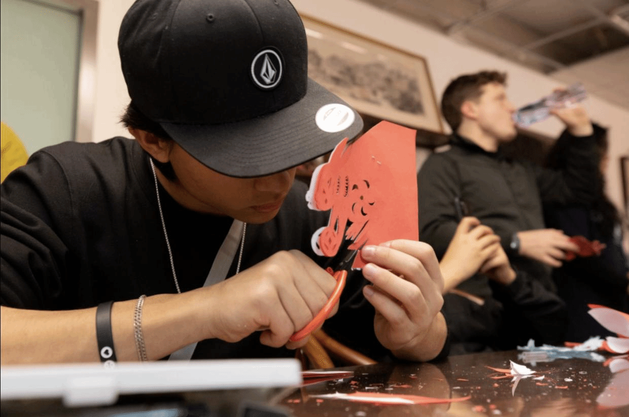 黑龙江省桦树皮剪纸非物质文化传承人、美术学院副院长刘钻教授带领美术学院海山经纬工作室团队,带来了中华剪纸研学课程,给营员们留下深刻印象。刘钻教授向营员们介绍了中华剪纸的历史与文化内涵,尤其是生肖文化在国人文化生活中的重要位置。通过图文并茂的生动讲述,师生们对十二生肖的由来、性格特征以及吉祥寓意有了初步地了解。刘钻教授又展示了他的原创剪纸《行运十二生肖》系列作品,详细介绍其中的创作思路以及所用到的吉祥元素,并鼓励大家动手制作属于自己生肖的剪纸作品。在刘钻教授的指导下,营员们亲手操起了剪刀和红纸,从简单的几何图形到复杂的生肖图案,逐步掌握了剪纸的基本技巧。每一次剪下的纸屑,仿佛都在诉说着中国传统文化的精妙与深邃。