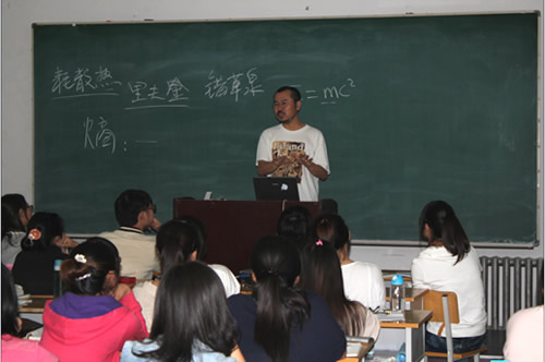针对师生的专业特点,田松老师这次讲座的题目是《从热力学第二定律看人类文明的进步》。田松老师深入浅出的讲座方式,吸引了每一位在场的听众。他从大家日常生活中喝矿泉水、扔矿泉水瓶这样不经意间的小事作为切入点,引申阐述了当代工业文明无法克服的后遗症——垃圾问题。而这一问题之所以无法解决,不是毫无根据的臆想和假设,而恰恰是建立在大家已经熟知并承认的热力学第二定律基础之上,一切物质和能量最终将变成毫无用处的四种基本形式——废水、废气、废物和“耗散热”。