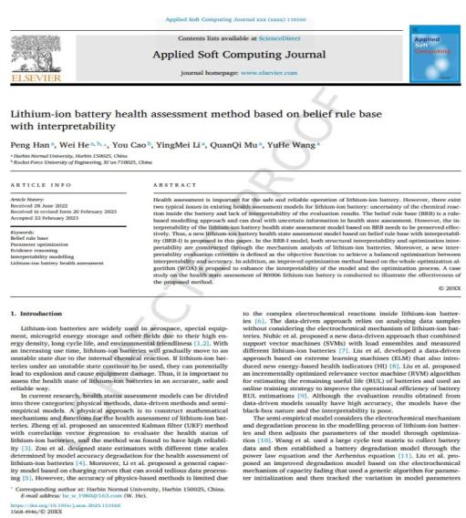 (季伟东/文)我校计算机科学与信息工程学院贺维老师研究团队,在人工智能的可解释性建模研究领域取得重要进展。研究成果“Lithium-ion battery health assessment method based on belief rule base with interpretability”在国际著名学术期刊Applied Soft Computing上发表,期刊为计算机科学Top期刊,影响因子8.263。论文第一作者为计算机科学与信息工程学院2021级电子信息专业硕士研究生韩鹏。这是我校首次以第一单位在该刊物上发表人工智能领域方面的文章。