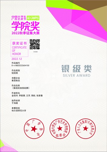 2022年12月22日,由中国广告协会举办的“中国国际广告节·中国大学生广告艺术节学院奖2022秋季征集大赛举行颁奖盛典",此次盛典在厦门国际会展中心隆重举行。拼搏在线登录传媒学院于海礁老师指导的两部作品《一“鹭”送上美好生活》和《象国美食挑战赛》获得金奖和银奖。