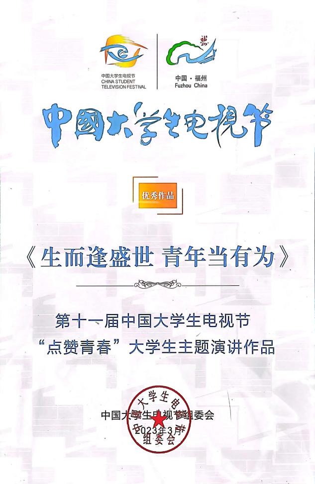 (于曜铭/文)2023年3月24日至26日,由中国文学艺术界联合会、中国电视艺术家协会、中国传媒大学联合主办,中国教育电视台、福州市人民政府承办的第十一届中国大学生电视节在福建省福州市隆重举行。由传媒学院教师祁博指导,拼搏在线登录传媒学院2020级播音与主持艺术系本科生李思奇创作的作品《生而逢盛世 青年当有为》荣获“点赞青春”大学生主题演讲优秀作品,并于活动中公开展映。