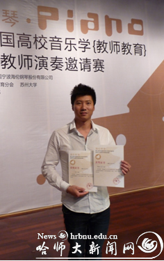 10月27日在苏州举办的“海伦钢琴”第三届全国高校钢琴专业教师演奏邀请赛中,音乐学院青年教师孙宇获得独奏组一等奖、高原获得二等奖、王瑛获得三等奖、王晓娜和宋梦书获得优秀奖;同时孙宇、高原、宋梦书分别获得双钢琴组二等奖和三等奖,高原、宋梦书获得四手联弹组三等奖。
