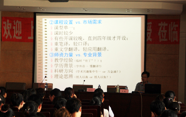 讲座主要从英语教学新形势、翻译教学的问题与困惑、改革与转型和多样化与国际化四个方面展开。张健阐述了翻译和翻译教学的根本目的,以建国后国内英语专业及课程设置演进历史为参照,用诙谐幽默的语言、大量鲜活的案例讲解了翻译教学中的问题与困惑,分析了翻译学科的未来走向和国际化背景下我国翻译人才应该具备的基本素养。