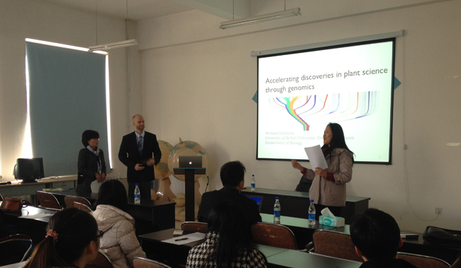 报告会上,院长于丽杰教授首先向在座的老师和同学介绍了二位学者的学术贡献。戴豪勒斯教授是加拿大植物学会理事、国际“千种动植物转录组测序计划项目(1KP)”发起人之一。他的主要研究方向为植物生物技术和应用基因组学,多年来从事亚麻纤维和细胞壁发育机理、细胞壁在植物生物和非生物胁迫过程中作用、植物固有无序蛋白等方面的研究。张健研究员多年来主要从事生态基因组、宏基因组等应用基因组学研究,目前是“基因组学在加拿大环境修复中的应用”等大的研究项目的协调人,获多项美国发明专利。二位学者在国际植物基因组学领域都具有重要影响。
