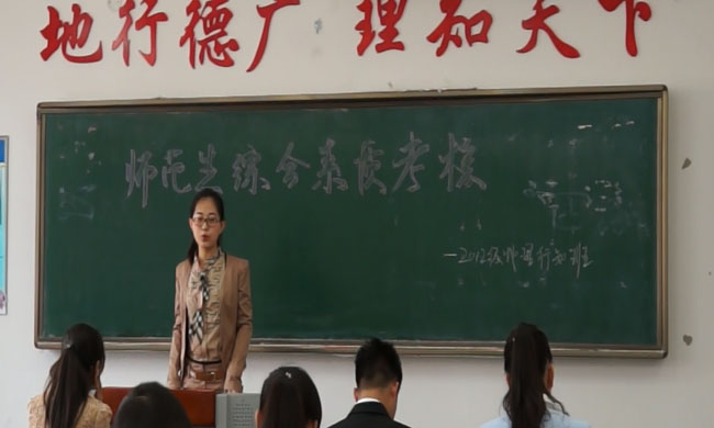 学院在上学期末寒假前,给2012级全体学生布置了综合素质考核的任务和要求,本学期开学初各班级进行了训练,综合素质考核要求学生分别从成长经历、社会实践、学习成绩、兴趣爱好、个人规划、座右铭(板书展示)、为何选择做一名教师以及如何做一名优秀教师等八个方面向评委展示自己,同时,学院在学生个人展示阶段模拟了作为应届师范毕业生求职面试自我介绍和问答等情境。评委们根据每位学生的展示认真严谨负责地针对学生仪容仪表、语言表达、板书展示、内容表达和仪态展示五方面综合素质进行评分,指出学生不足之处以及学生应改进的方法。