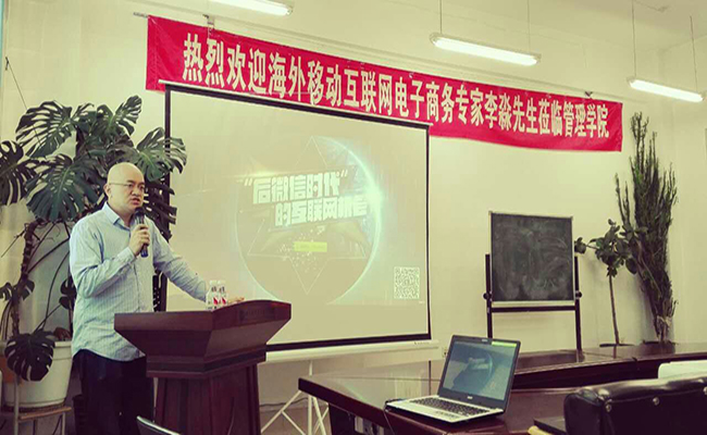 (张巍/文)应管理学院教师徐光教授的邀请,旅居北美多年,跨越中西方互联网文化的移动互联网专家李淼博士于3月28日到学院作讲座。他是多年从事电商和互联网、全程电子商务的倡导者和实践者,是前加拿大BestDeal Onine Ltd,CEO,互联网电子商务O2O业务专家;前美国CNMP Networks,CTO,40G光传输、光交换技术专家;前华为技术骨干、路由器技术专家,现任上海维在网络科技有限公司CEO。