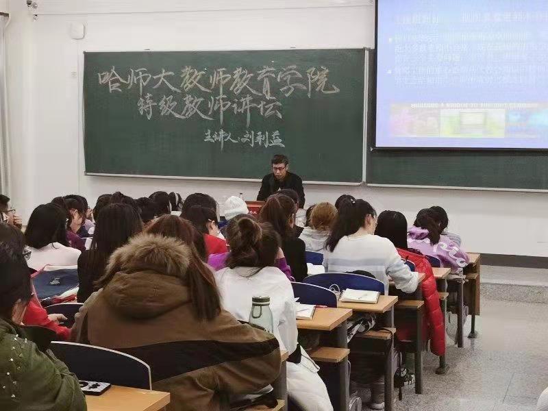 (高军/文)教师教育学院于11月26日晚在崇师楼C区402举办“特级教师讲坛”活动。来自哈师大附中数学特级教师、中学数学正高职教师,中国数学奥林匹克高级教练员,2018年入选国家“国家级人才项目入选者”教学名师的刘利益老师做了题为“中学名师的成长规律之我见”的讲座,教师教育学院三个年级的数学行知班学生和部分老师200余人聆听了讲座。