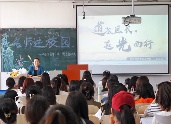韩吉青列举了复华小学的优秀教师,为同学们提供了学习的榜样,并向同学们提出如何做好老师、做有效教师这一问题。同学们积极与老师互动,发表自己的观点,给出了自己心目中的答案。韩吉青给出了有效教师的定义:一定是一位专业过硬、有丰富的教学方法,对学生满怀期待且值得被信任的教师。随后,她提出了具体建议:一是反思自己,吾日三省。要做到身心健康、忠于教育、热爱教学,具备扎实的专业知识、完善的人格态度;二是钻研教材,做到烂熟于心。只有充分理解教材,才能给学生讲好课,解好疑。最后她播放了一部短片,带学生们了解优秀教师的成长之路,展示了教师们的风采,引来了同学们的阵阵掌声。