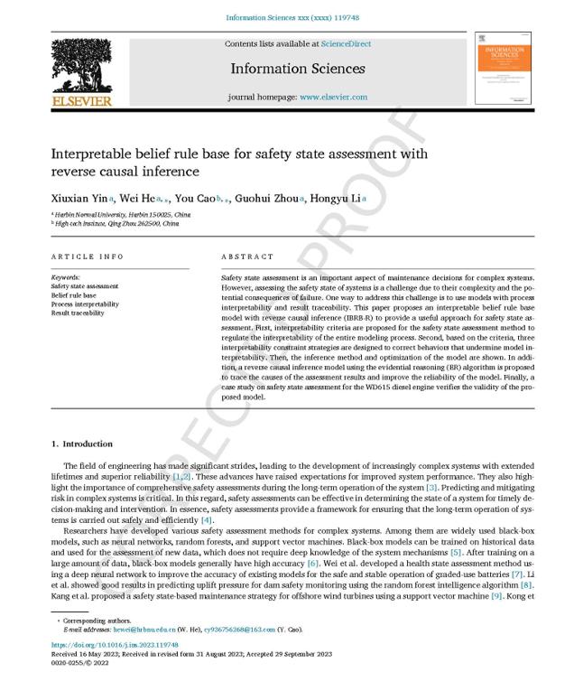 (季伟东/文)近日,我校计算机科学与信息工程学院贺维老师研究团队,在人工智能的可解释性建模、因果推理的结果可追溯性研究领域取得重要进展。研究成果“Interpretable belief rule base for safety state assessment with reverse causal inference”在国际著名学术期刊Information Sciences上发表,期刊为计算机科学一区Top期刊,影响因子8.1。论文第一作者为计算机科学与信息工程学院2022级计算机技术专业硕士研究生尹修贤,我校为论文的第一单位。