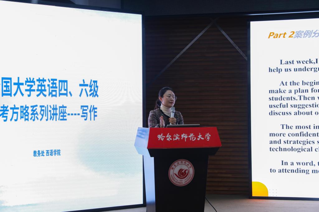 本场写作专题讲座主讲教师是西语学院丁玲玲副教授,硕士生导师,曾获“第七届拼搏在线登录优秀中青年教师教学奖”,2021年外研社全国“教学之星教学大赛团队特等奖”;曾多次担任大学英语四、六级考试写作阅卷员、领队等工作,具有丰富的实践经验。