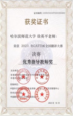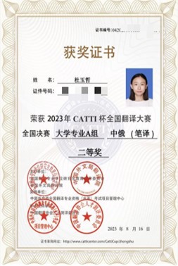 (史良/文) 近日,2023年CATTI杯全国翻译大赛决赛圆满收官。斯拉夫语学院2022级俄语语言文学专业研究生杜玉哲同学(指导教师:徐英平教授)在激烈的角逐中脱颖而出,喜获全国决赛大学专业A组中俄(笔译)二等奖,实现了斯拉夫语学院该项赛事决赛获奖零的突破。