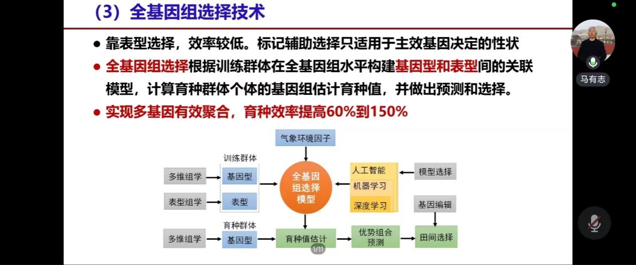 马有志研究员此次的报告主题为“生物育种发展现状与展望”,在报告中,他深入阐述了我国生物技术育种的最新进展及未来的发展方向,详细介绍了转基因技术、基因编辑技术、全基因组选择技术和合成生物技术等不同方法的优缺点及其在作物上的实际应用。此外,他还提出了我国未来的育种方向——智能设计育种,强调了加强生物育种创新对于提高我国农业发展和生物技术研究水平的重要性。
