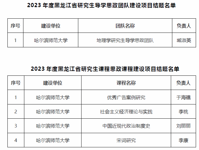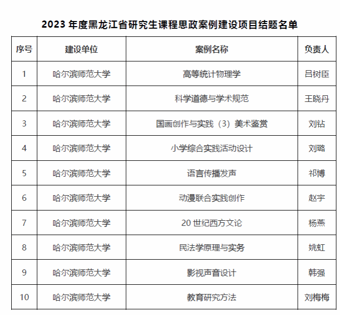 (韩雷/文)近日,省教育厅发布《关于公布2023年度黑龙江省研究生课程思政建设项目结题名单的通知》(黑教研函〔2024〕48号),省教育厅对2021年度立项且已按期完成建设的研究生课程思政建设项目进行了结题验收,我校共有15项研究生课程思政项目按期申报结题,经过省教育厅、省高水平专家团队审核,我校申报的15项结题项目全部通过审核。具体名单公布如下。