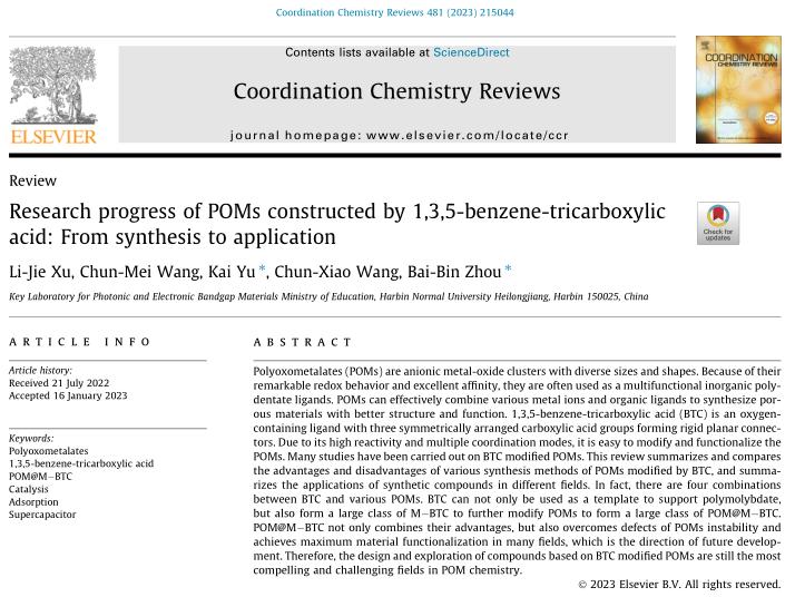 Li-Jie Xu, Chun-Mei Wang, Kai Yu*, Chun-Xiao Wang, Bai-Bin Zhou*.Research progress of POMs constructed by 1,3,5-benzene-tricarboxylicacid: From synthesis to application.Coordination Chemistry Reviews, 2023, 481,2015044.