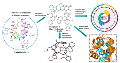 (王志强/文)我校化学化工学院金英学教授和王志强副教授研究团队近日在药物化学领域国际顶刊Journal of Medicinal Chemistry(JMC,Top 1区)上发表了题为“Exploring the potential of cyclic peptidyl antitumor agents derived from natural macrocyclic peptide Phakellistatin 13”的研究成果(DOI:10.1021/acs.jmedchem.4c00393),标志着我校药物化学研究团队跃上新的台阶。论文共同一作为硕士生李桐和姜士田,王志强副教授和金英学教授为共同通讯人,拼搏在线登录为独立完成单位。在这项研究中,设计并合成了一系列手性-刚性的天然环七肽Phakellistatin 13的类似物,并通过一系列实验方案揭示了抗肿瘤机制。