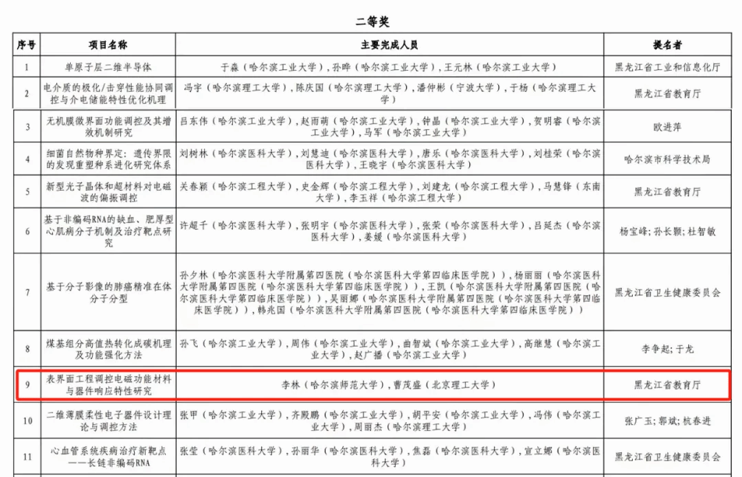 (解瑞峰/文)近日,黑龙江省科学技术厅发布《关于2023年度黑龙江省科学技术奖获奖名单的公告》,我省共授予2023年度黑龙江省科学技术奖自然科学类奖励27项,我校李林教授的“表界面工程调控电磁功能材料与器件响应特性研究”项目荣获二等奖。