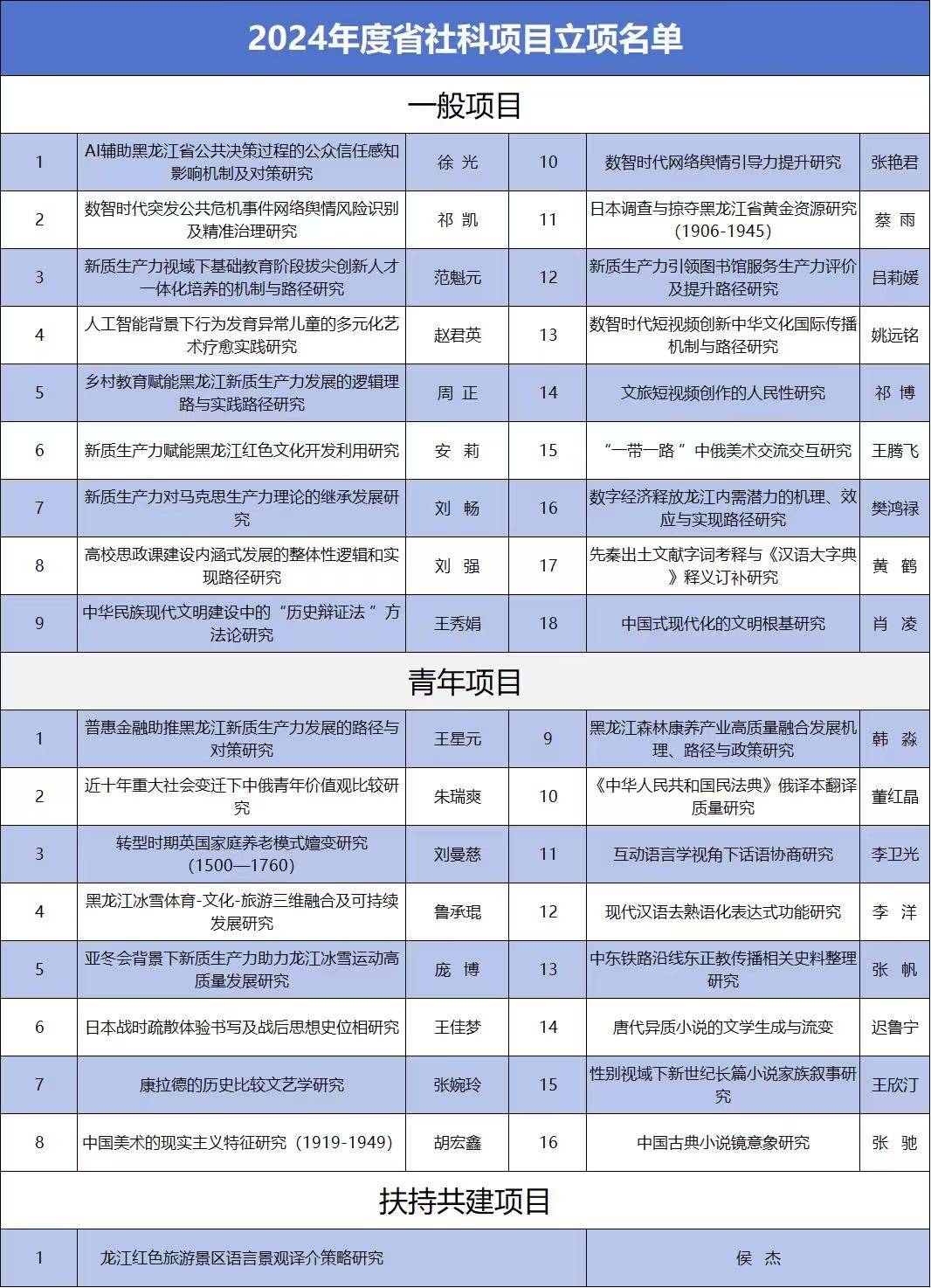 近日,黑龙江省哲学社会科学工作办公室公布了《2024年度省社科研究规划项目拟立项名单》,我校获批省社科研究项目35项,其中一般项目18项、青年项目16项、扶持共建项目1项。