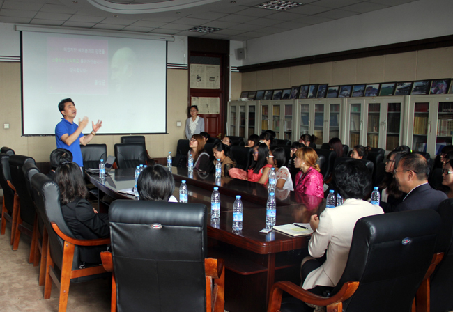 9月14日上午,东语学院在社科楼313室举行了韩语文化讲坛活动。韩国朝鲜大学国语国文学院博士生导师、韩国语学堂院长姜喜淑教授,韩国南部大学平生教育院院长、博士生导师洪性均教授分别做了题为“韩国语文字的科学性”、“中韩教育改革扩展的新方向”的讲座。东语学院党总支书记李世龙、副院长金锦善、韩语系外教以及师生参加了此次活动。