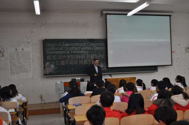 吴唯民博士首先用轻松幽默的语言从斯坦福大学的历史出发,为同学们介绍了斯坦福的建校经历、学校的整体概况、财务状况、专业设置以及与产业界的关系原则等内容。随后,他向同学们介绍了可持续发展理念,认为持续发展是环境技术新思维的基础,作为一名生物研究工作者,树立好可持续发展观念至关重要;同时他着重强调了良好的学科建设和团队协作的重要意义。最后,作为环境工程与科学领域的知名专家,他还围绕废水处理、生物修复、厌氧技术、工艺设计、学术创新等话题与同学们进行了深入的交流。