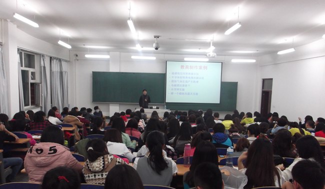 (王硕/文)为了培养学生全面的从师技能,掌握教具制作和使用方法,培养学生实际动手能力,在教务处和学生就业指导处的帮助下,结合学院即将要举行的首届师范生教具制作大赛,教师教育学院于11月11日举行“行知学堂”第二十四场报告会。报告会特邀请物理与电子工程学院硕士生导师、普通物理实验室主任王景聚教授做题为“师范生教具制作辅导”的讲座。学院报名参加教具比赛的200多名学生听取了报告。