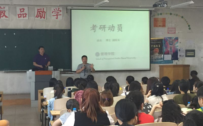 会上,学院副院长万立军通报了学院研究生基本情况与就业行势,并告诫同学们考研路上一定要持之以恒,不可半途而废。学院副院长徐光介绍管理学院研究生课程设置、培养目标并系统讲解考研过程中的种种细节,并希望同学们能通过考研、读研来拓宽自己的知识面,实现自己的人生理想。