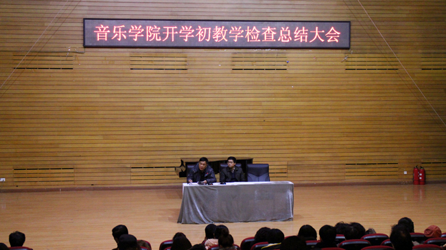 (关迪/文)3月9日,音乐学院在音乐厅召开了开学初教学总结大会,学院党委书记王彬,党委副书记乔永刚,副院长王立和、王宏宇、孙鹏出席会议,全院教师参加了会议。会议由孙鹏主持。