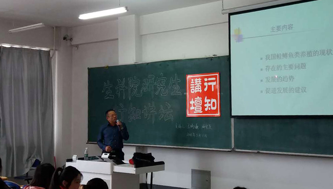 (祝亚楠/文)一年一度的科技文化节是我校校园文化建设中的重要内容之一,文化能使人的道德更加高尚,科技能使人的思维更加敏捷。秉承促进学生全面发展的基本原则,以弘扬中华传统优秀文化,倡导学术交流,营造研究生创新、实践的科研学术氛围,提升师生专业素养,引导广大研究生崇尚科学、追求真理、求实创新、努力成才为目标,生命科学与技术学院于5月11日下午在崇师楼C306教室举办了行知讲坛学术报告会。报告会邀请了1982级校友王炳谦研究员为学院师生做了以“我国鲑鳟鱼类养殖现状及发展趋势”为主题的学术报告会。学院全体研究生参加了本次报告会。