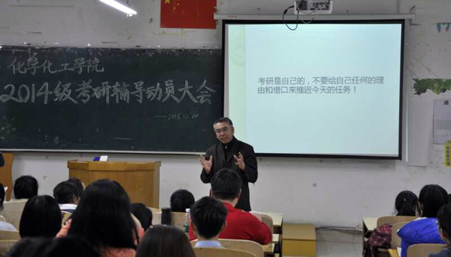 (刘国权/文)为鼓励学院2013级学生调整心态,积极备考,在研究生考试中取得优异成绩,帮助学院2014级学生树立考研目标,明确准备方向,12月20日,化学化工学院举办考研辅导动员大会。2013级、2014级学生参加会议。