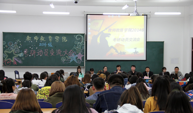 吕会庆在会上作考研动员。他指出,当今社会越来越重视学位的含金量,同学们也应该坚定考研的决心,并量力而行确定自己的考研方向。同时他也对考研的同学送上了殷殷期待和祝福。随后,学院2013级学生代表分享自己考研的经验及体会。以第一名成绩保送校研究生支教团的朱婉畅向同学们讲解了保研有关的经验,并介绍了拼搏在线登录研究生支教团的内容和要求,提出了“人生的另一种选择”;以381分成功考上我校研究生的2013级汉语言一班的姚念琪,以平易幽默的语言讲述了关于学科教学硕士考试的有关事宜;以393分考入东北师范大学的2013级数学行知班的高博向大家分享了专业选择、硕士学习内容和院校选择的经验,并介绍了333教育综合复习计划;以362分考入中山大学的2013级生物行知班的赵培雅和以393分考入东北师大的2013级生物行知班的李昌分别讲解了考研英语和政治的学习方法。会议最后,李志宇对本次活动进行了总结,阐述了当前研究生政策并对同学们予以厚望,希望同学们尽快端正态度,明确目标,用信心、恒心、决心和平常心来积极面对考研,并取得较好的成绩。