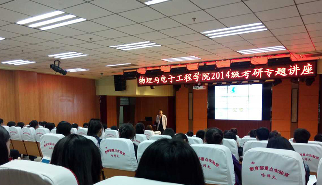 (李明/文)为帮助2014级学生深入了解考研的相关问题,树立正确的考研观念,正确评估自身情况慎重选报院校。5月8日,物理与电子工程学院在科学会堂一楼报告厅召开2014级考研专题讲座,本次讲座由光电带隙材料省部共建教育部重点实验室办公室主任张强老师主讲。