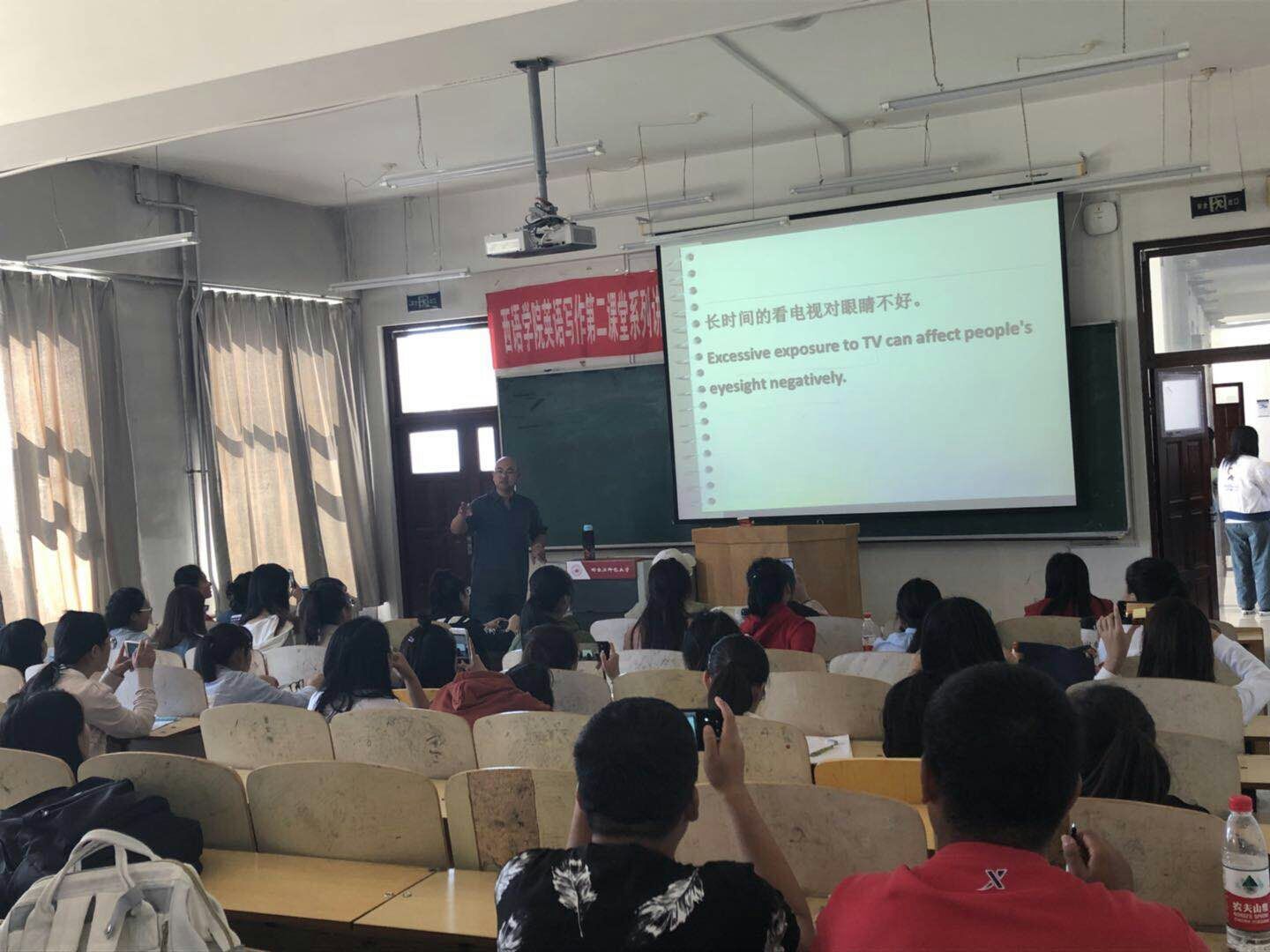 本系列讲座从英语专业四级考试、专业八级考试、雅思考试多角度出发,分别解读不同考试的评分标准、考核理念和侧重的能力等。讲座深入浅出,内容丰富,让同学们对于英语写作学习有了更深的认识。同学们在聆听讲座中秩序井然,表现出了极大的学习兴趣。讲座结束后,同学们纷纷表示受益匪浅。